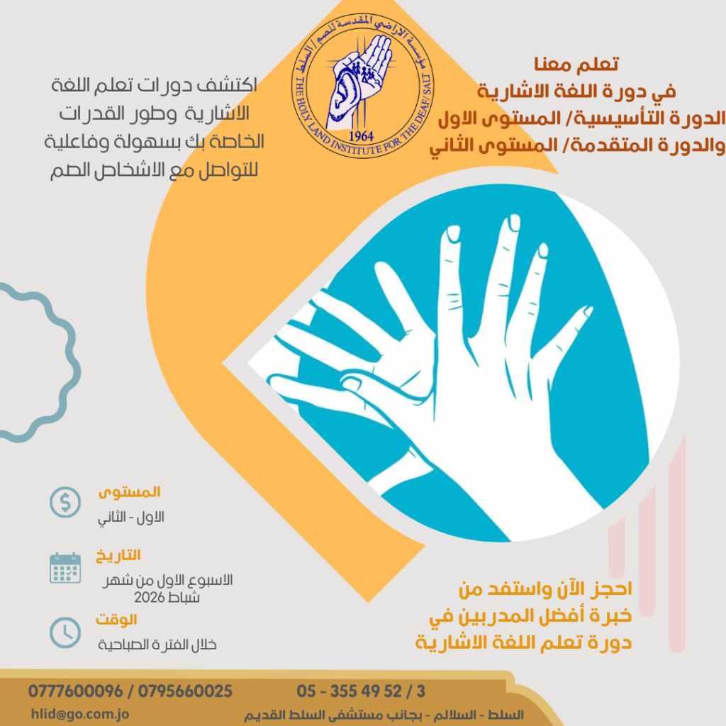 تعلن مؤسسة الاراضي المقدسة للصم عن بدء التسجيل لدورات لغة الاشارة ضمن مساق المستوى الاول والمستوى الثاني